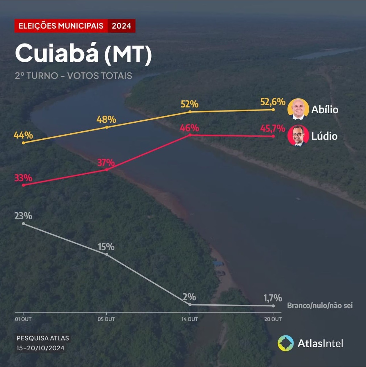 A nova pesquisa AtlasIntel, divulgada nesta terça-feira (22), mostra o deputado federal Abilio Brunini (PL) com 52,6% das intenções de votos contra 45,7% do deputado estadual Lúdio Cabral (PT) a seis dias do segundo turno das eleições em Cuiabá.