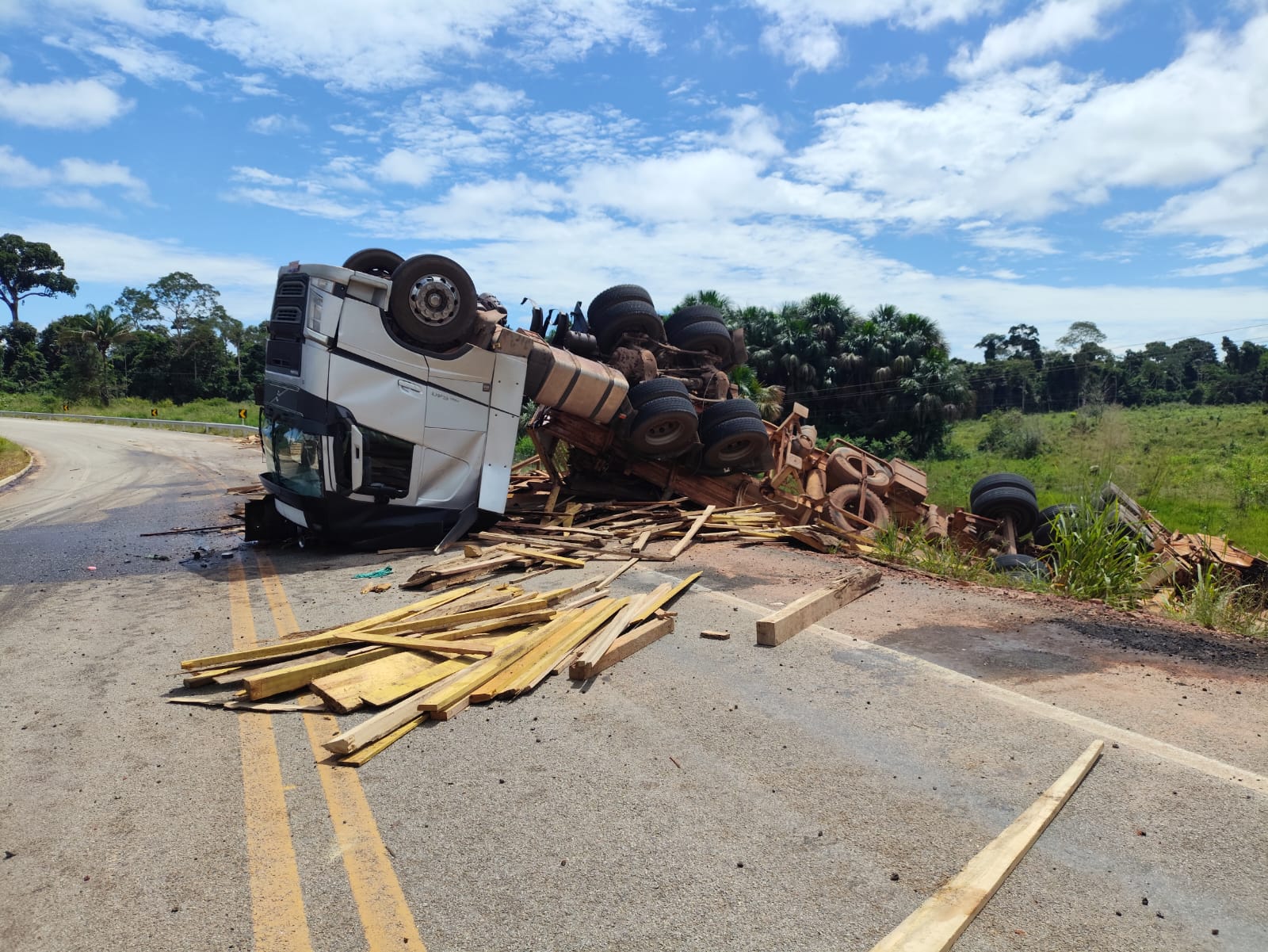 Bitrem carregado com madeira tomba na MT-206 em trecho próximo a Apiacás