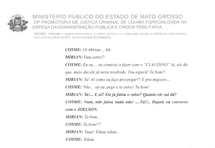 “Quanto a conversa interceptada, esclareceu que fora referente a dois processos de consulta prévia que estavam com o servidor Claudino e, em virtude da demora, solicitou ajuda a Cosme, o qual informou que deveria ser pago um valor a Claudino. Assim, repassou o valor solicitado a Joelson, oportunidade que ocorreu a liberação de um dos processos”, diz trecho da denúncia.