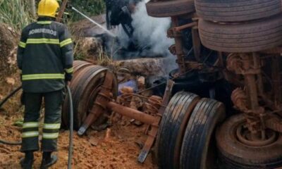Fogo teve início após o motorista do veículo perder o controle da direção e colidir com pedras às margens da rodovia Foto: Reprodução O Corpo de...