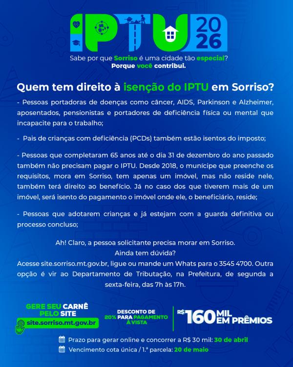 Ah! Lembre-se: o solicitante deve residir em Sorriso. O pedido de isenção deve ser renovado todo ano, por meio de um processo junto ao Departamento de Tributação.