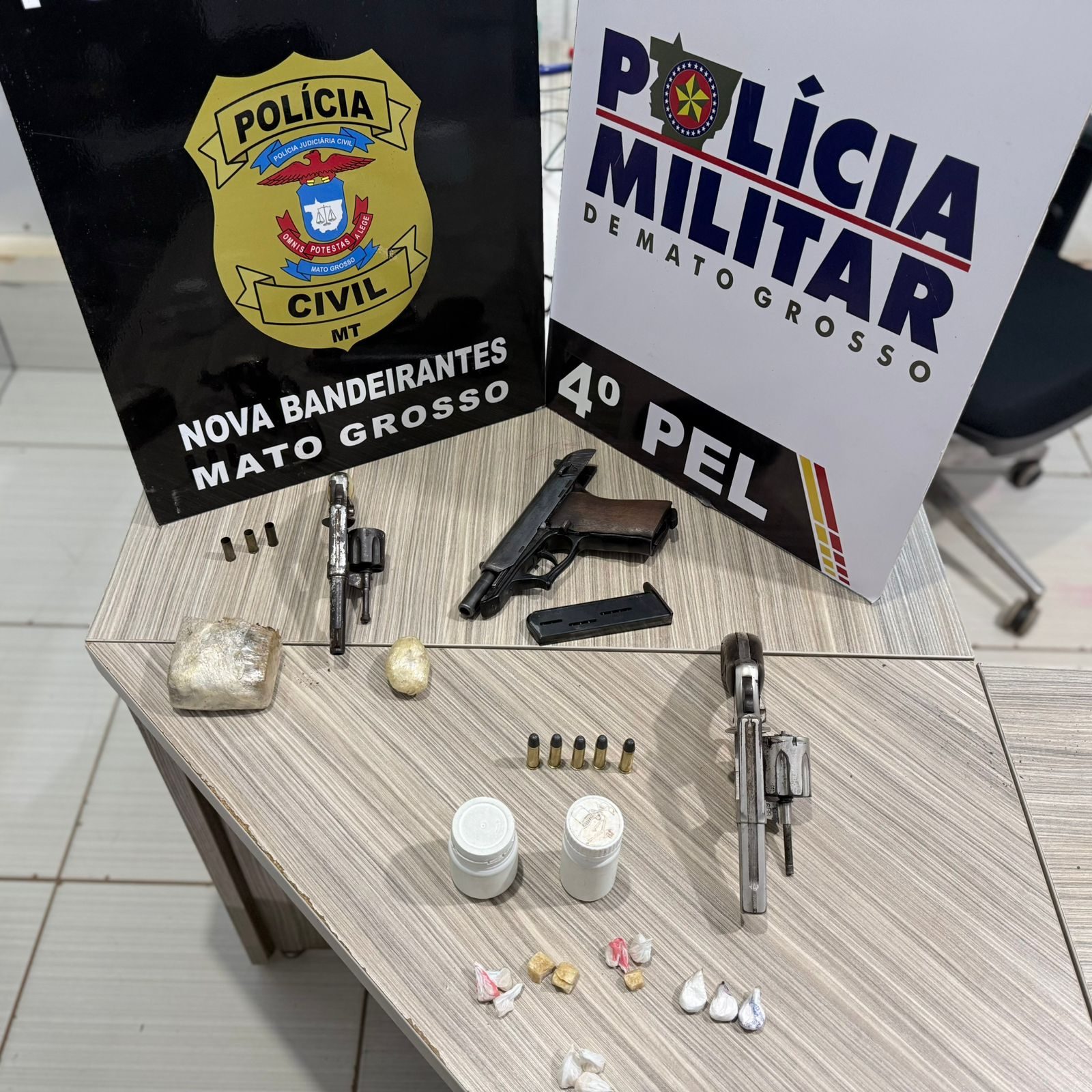 Ainda durante o retorno ao núcleo urbano, nas proximidades do garimpo Novo Astro, os policiais abordaram outro suspeito, identificado como Nelson Dias dos Santos, que também possuía mandado de prisão em aberto. Com ele foi encontrado um revólver calibre .38 com seis munições intactas e porções de entorpecentes. Conforme a PM o conduzido é braço direito da ” Angeliquinha” foragida da Justiça e liderança do CV na região norte do estado.