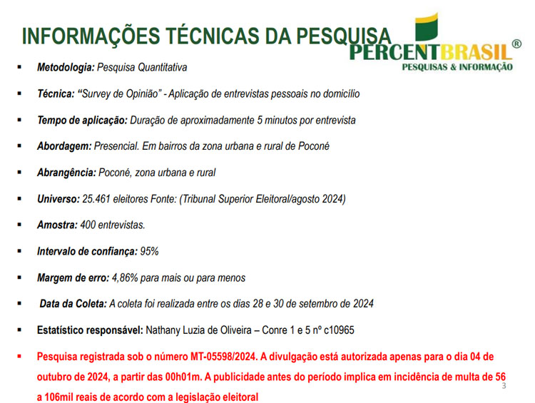 O intervalo de confiança da pesquisa é de 95% e a margem de erro é de 4,86% para mais ou para menos. A pesquisa foi registrada sob o número MT-05598/2024.