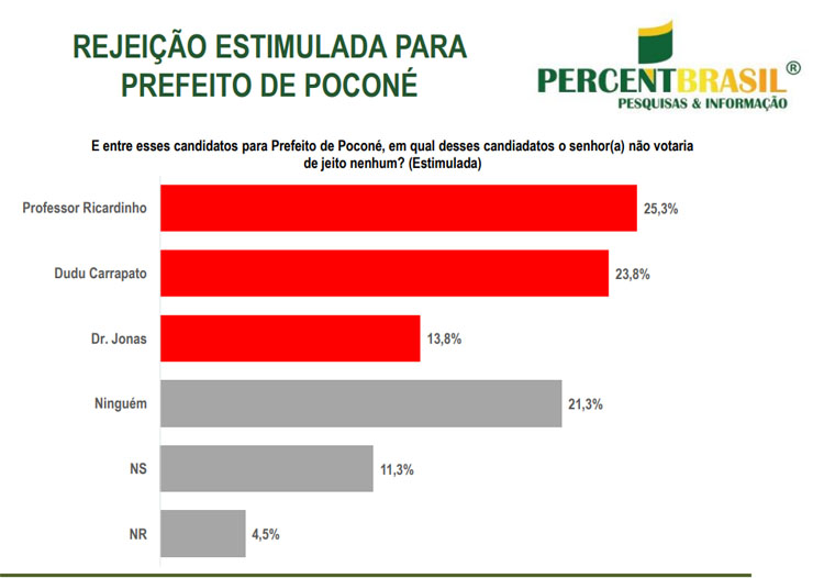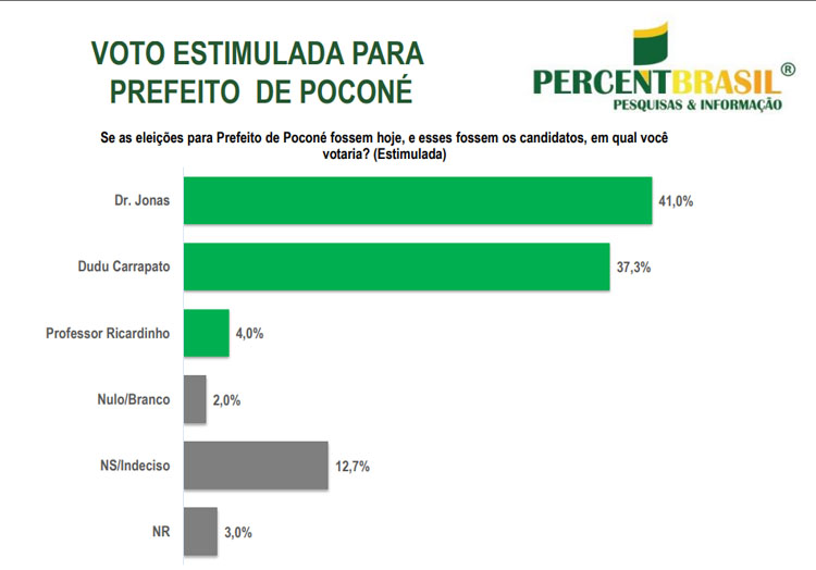Uma pesquisa divulgada pelo Instituto Percent Brasil apontou o candidato Dr. Jonas (Podemos) na liderança da corrida pela Prefeitura de Poconé.