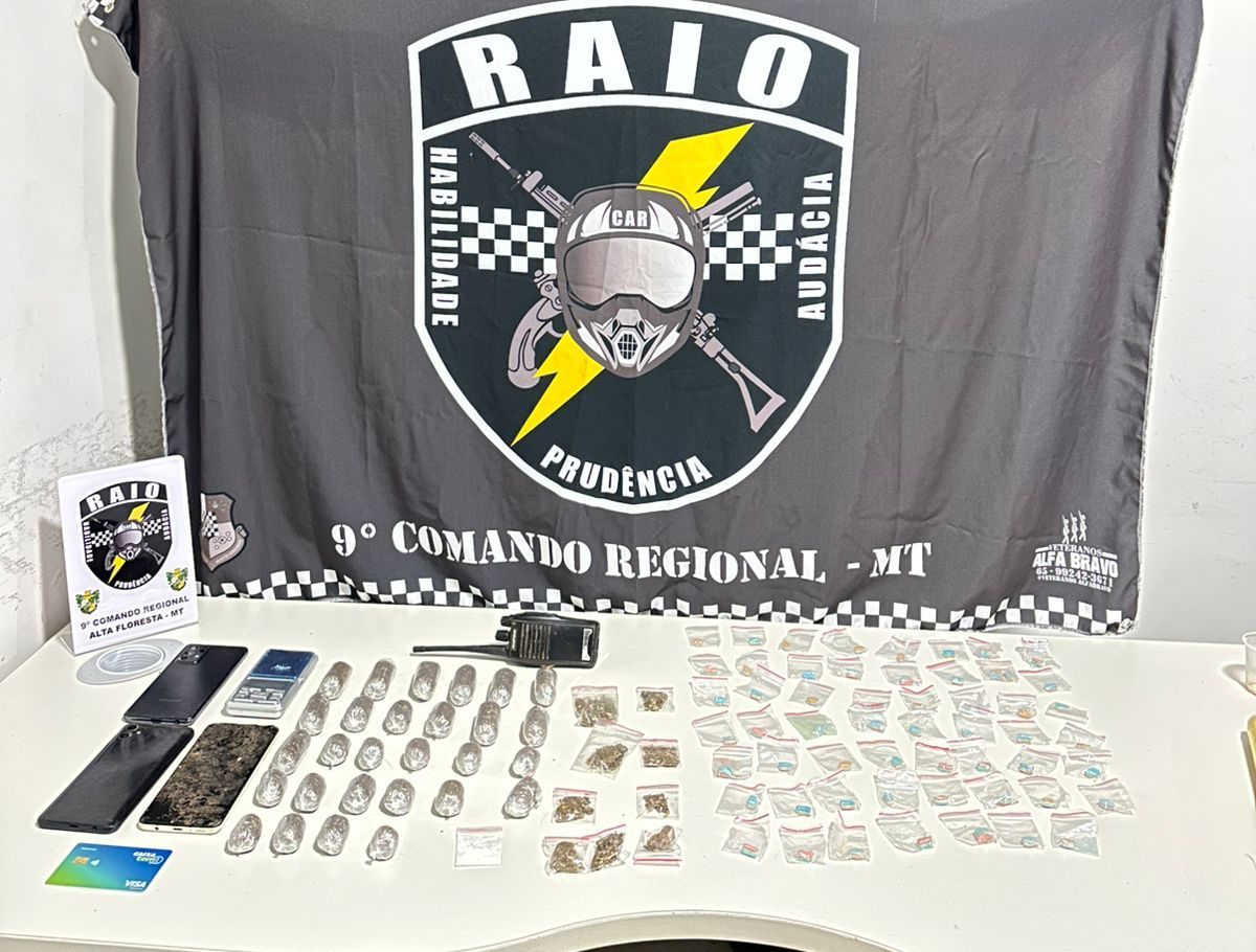 Uma ação da equipe de motopatrulhamento tático RAIO – Rondas e Ações Intensivas e Ostensivas, resultou na apreensão de entorpecentes e diversos objetos relacionados ao tráfico de drogas na noite de sexta-feira (27), no bairro Jardim das Oliveiras, em Alta Floresta.