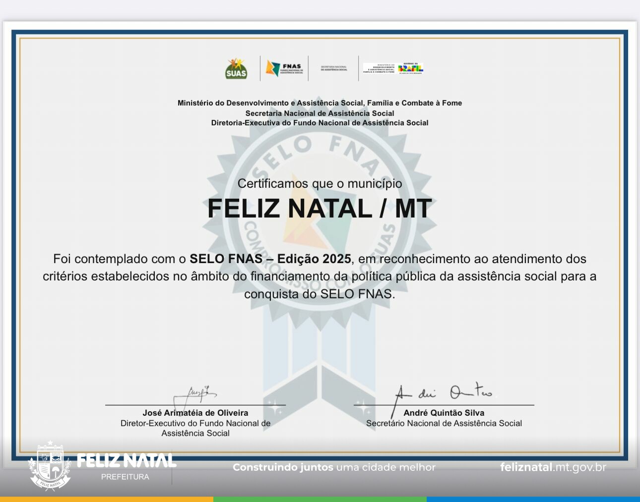 Feliz Natal conquista o Selo FNAS 2025 e reforça compromisso com a transparência e a qualidade na Assistência Social O município de Feliz Natal celebra uma importante conquista na área da Assistência Social: a obtenção do Selo FNAS 2025 – Excelência e Transparência na Gestão do SUAS. O reconhecimento, concedido pelo Fundo Nacional de Assistência Social (FNAS), destaca os municípios que se sobressaem pela gestão eficiente, responsável e transparente dos recursos públicos destinados à política de assistência social. A conquista do selo reafirma o compromisso da administração municipal com a qualidade dos serviços ofertados à população, especialmente às famílias em situação de vulnerabilidade. Mais do que um reconhecimento, o Selo FNAS representa o resultado de um trabalho contínuo, pautado na responsabilidade, organização e no fortalecimento do Sistema Único de Assistência Social (SUAS). Esse avanço é fruto do empenho das equipes técnicas, gestores e profissionais da Assistência Social, que atuam diariamente com dedicação para garantir direitos, promover inclusão e oferecer um atendimento cada vez mais humanizado à comunidade. A Prefeitura de Feliz Natal segue firme no propósito de investir em políticas públicas que transformam vidas, fortalecendo a rede de proteção social e construindo um município mais justo, acolhedor e comprometido com o bem-estar de todos.