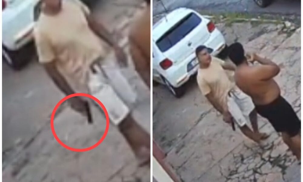 Imagens que circulam nas redes sociais mostram o momento em que o policial deixa a residência armado e aponta a pistola em direção ao filho, que estava na calçada acionando a Polícia Militar. No vídeo, uma filha do agente tenta intervir e acalmar a situação.