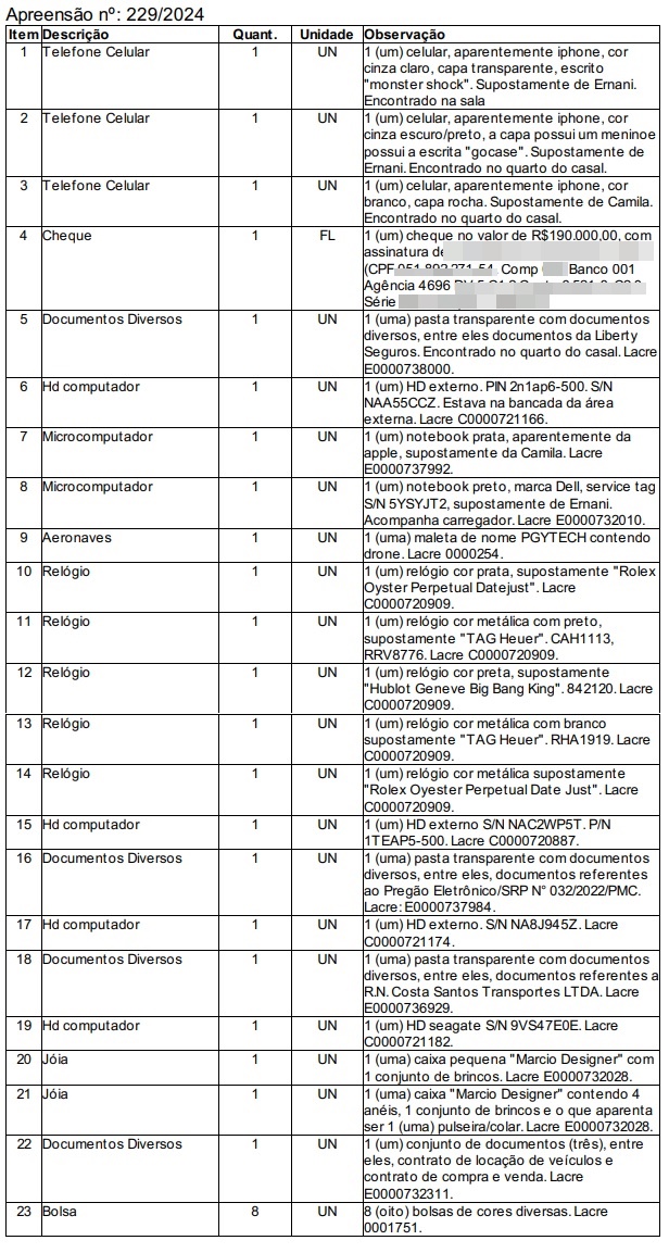 Veja lista de bens apreendidos: