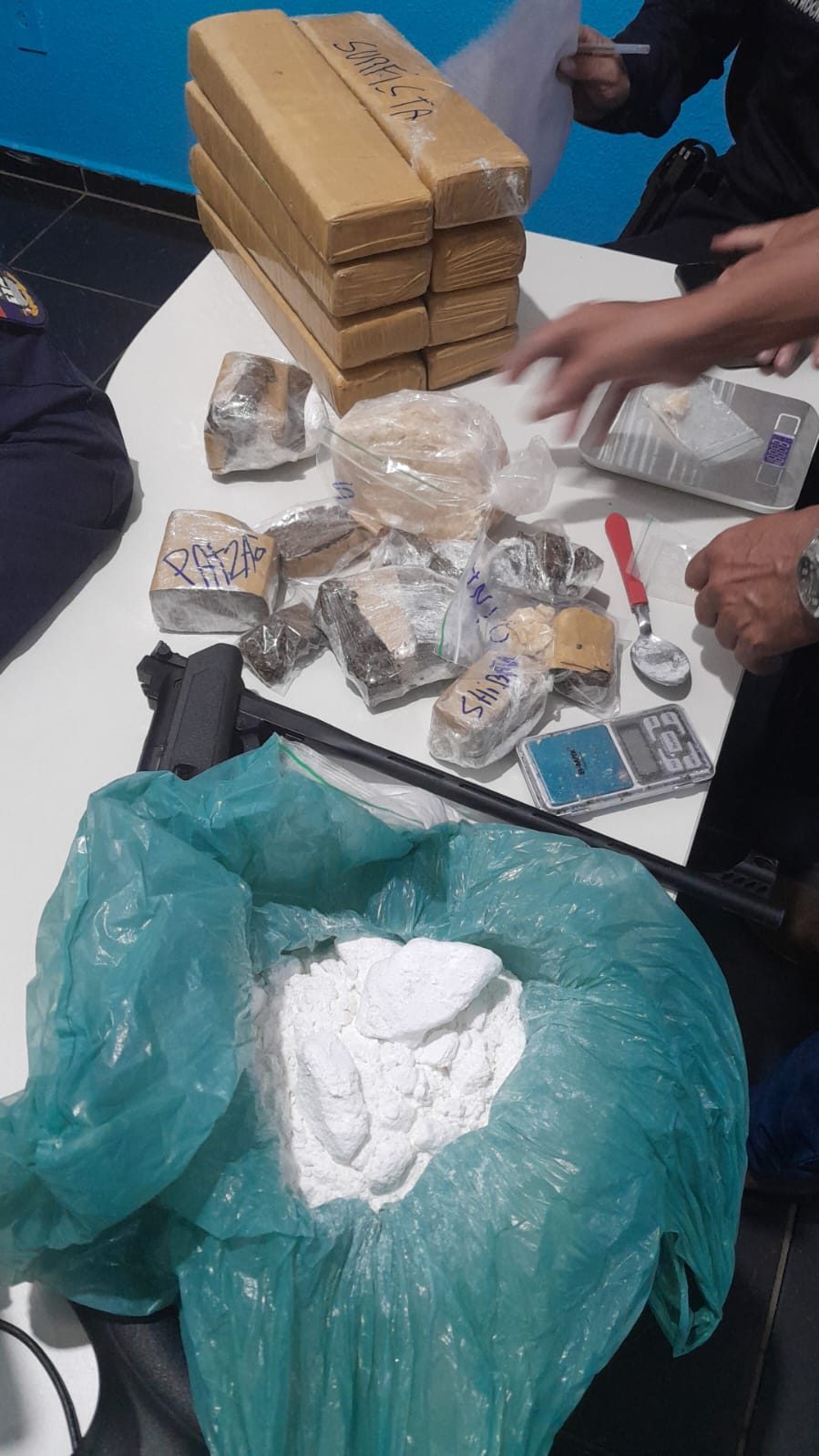Enquanto atendiam o animal no quintal, os policiais sentiram um forte odor de maconha vindo do interior da casa. Como a porta da sala estava aberta, a equipe avistou, logo de imediato, porções da droga espalhadas sobre uma mesa, além de uma balança de precisão.