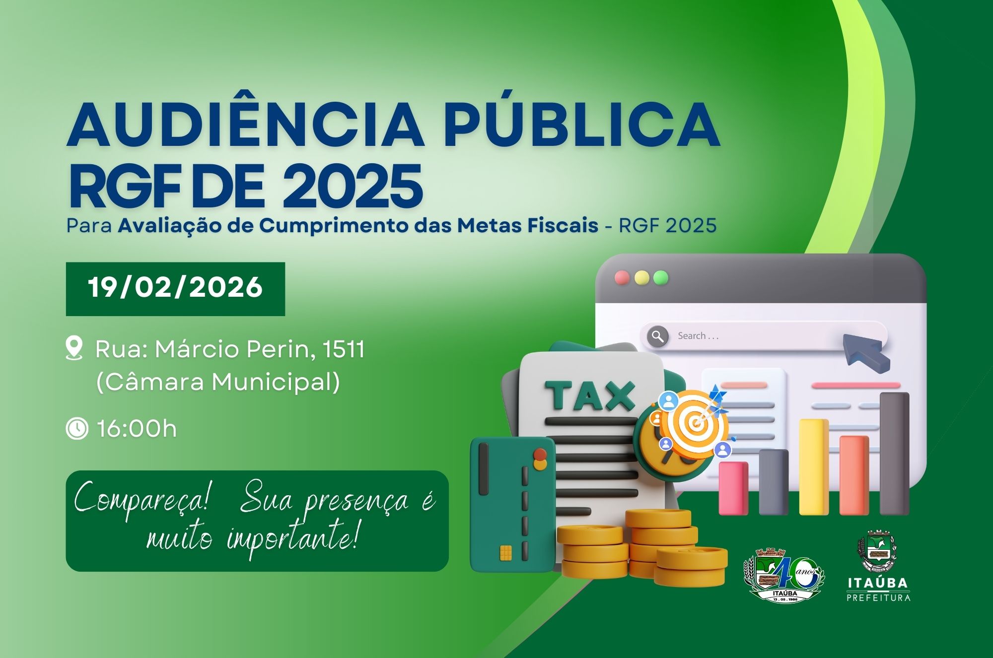 A Prefeitura Municipal de Itaúba, Estado de Mato Grosso, comunica à população que realizará Audiência Pública para apresentação e avaliação dos Demonstrativos Fiscais – Relatório de Gestão Fiscal (RGF) referente ao 3º Quadrimestre de 2025.