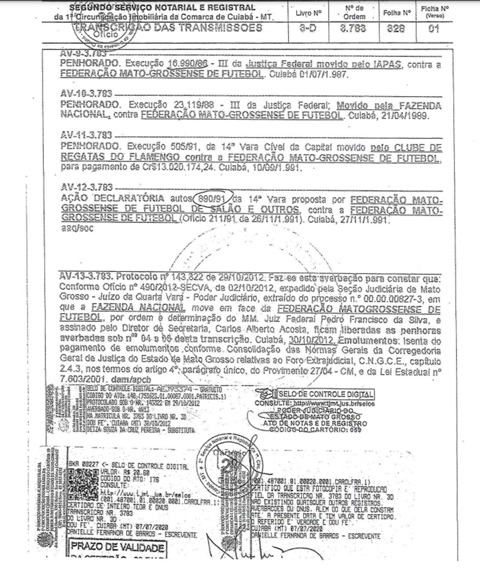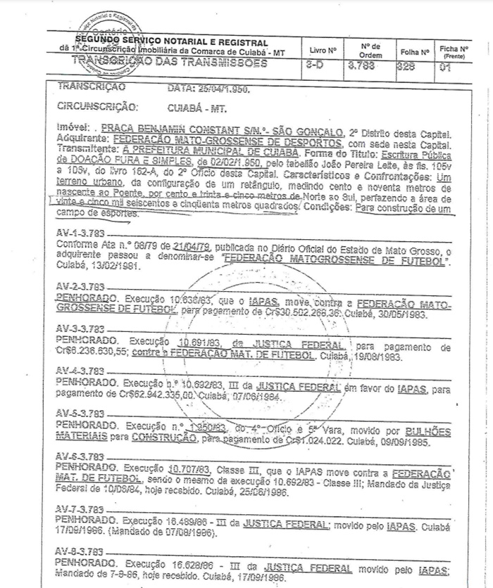 De acordo com o advogado da FMF, Maurício Faria Neto, a matrícula do imóvel continua em nome da Federação e, por isso, a concessão padece de uma insegurança jurídica “gigantesca”(veja fác-simile abaixo).