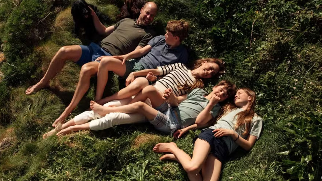 Na imagem compartilhada, os príncipes aparecem deitados em um campo ao lado dos três filhos: Príncipe George, Princesa Charlotte e Príncipe Louis. O clique, mais descontraído e familiar, evidencia o momento de união da família, longe da formalidade tradicional da realeza britânica.