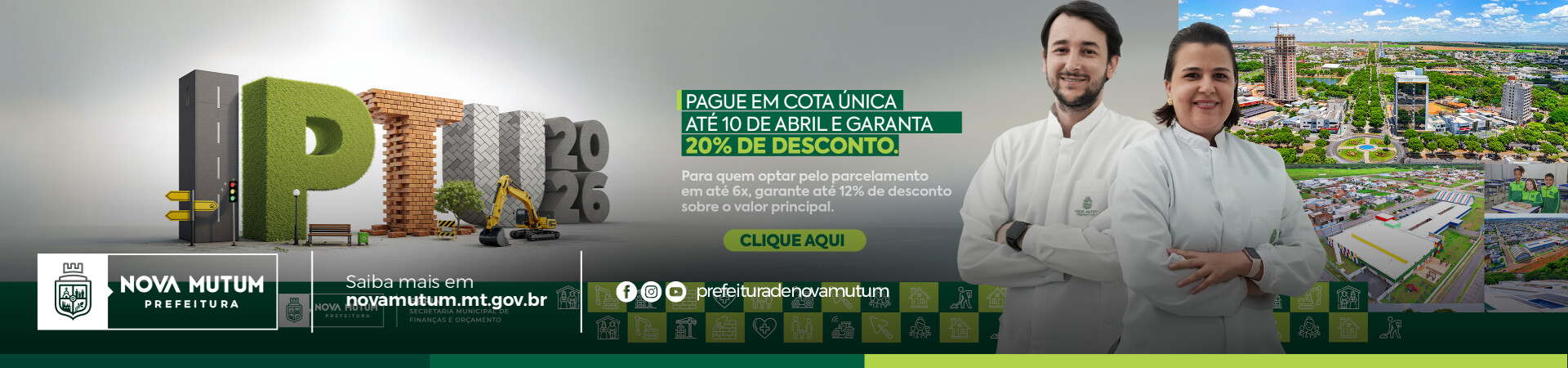A Prefeitura de Nova Mutum segue com a campanha de pagamento do Imposto Predial e Territorial Urbano (IPTU) exercício 2026. Essa iniciativa demonstra a sensibilidade da administração municipal em facilitar a regularização fiscal dos contribuintes, ao mesmo tempo em que fortalece as finanças públicas.