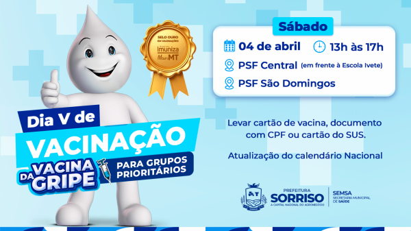 Mas se você é grupo prioritário e quer adiantar a dose, basta procurar qualquer uma das salas de vacina do Município a partir de amanhã, dia 02 de abril. Mas lembrando, nesse momento a vacina da gripe é direcionada aos grupos prioritários.