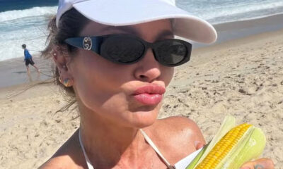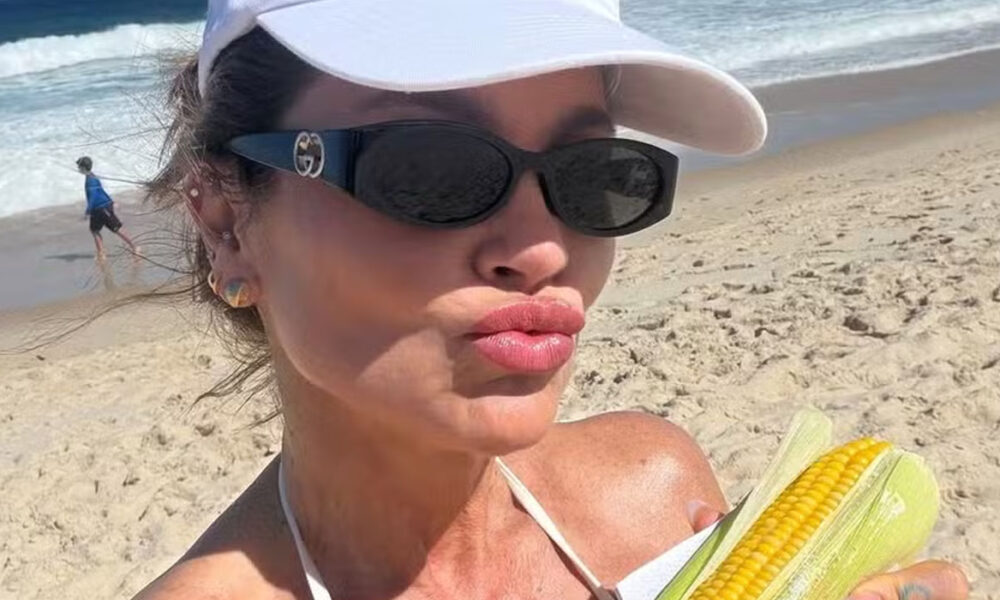 Em dia de praia, Flávia Alessandra aproveita para saborear milho verde à beira-mar