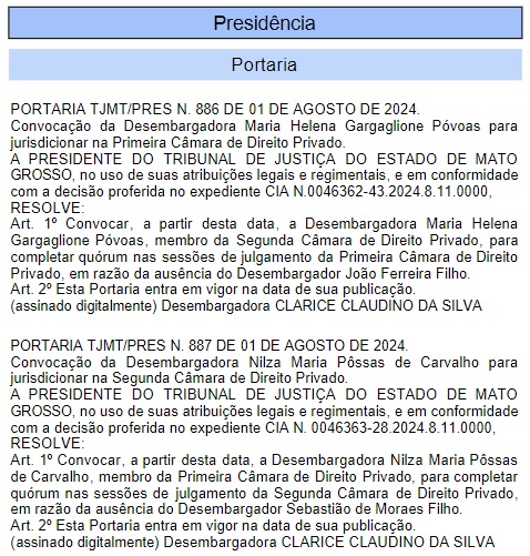 A presidente do Tribunal de Justiça de Mato Grosso, Clarice Claudino, publicou nesta terça-feira (6) mudanças nas câmaras de Direito Privado por conta do afastamento dos desembargadores João Ferreira Filho e Sebastião Moraes Filho.