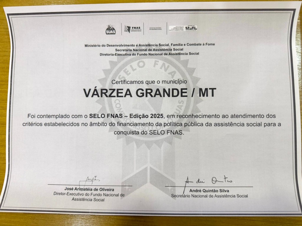 A Prefeitura de Várzea Grande, por meio da Secretaria Municipal de Assistência Social, recebeu nesta semana o Selo FNAS – Edição 2025, certificação federal que reconhece municípios que cumprem critérios rigorosos de responsabilidade na gestão financeira e contábil dos recursos destinados ao Sistema Único de Assistência Social (SUAS).